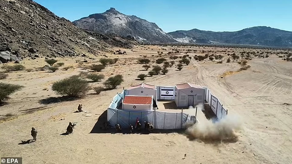 Yemen’s Houthis hold military drills near the Saudi border. In a released footage they show attack drills on a mock Israeli town, reminiscent of Hamas’ Oct 7 attacks. The video begins with a rocket being launched, followed by a series of explosions as commanders watch on in camouflage uniforms and red berets. Fighters are seen running into an imitation town consisting of several buildings and a water tower, marked by Israeli flags.