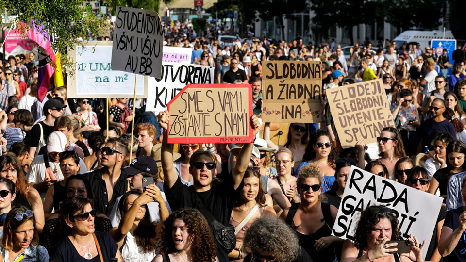 Some 18,000 people gathered for the second time this week in Bratislava’s Slovak National Uprising Square demanding the resignation of the nationalist culture minister, who has been accused of attacking artistic freedom and undermining democracy.