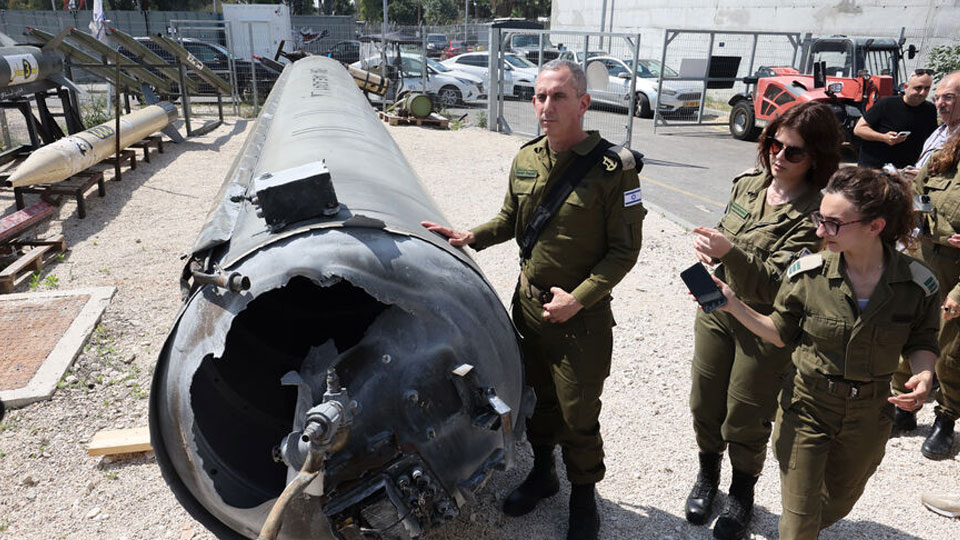 Members of the Israeli military showed an Iranian ballistic missile that fell in Israel on the weekend, during a media tour at the Julis military base near the southern Israeli city of Kiryat Malachi on April 16, 2024. Iran carried out an unprecedented direct attack on Israel overnight April 13-14, using more than 300 drones, cruise missiles, and ballistic missiles, in retaliation for a deadly April 1 air strike on the Iranian consulate in Damascus. Nearly all were intercepted, according to the Israeli army.