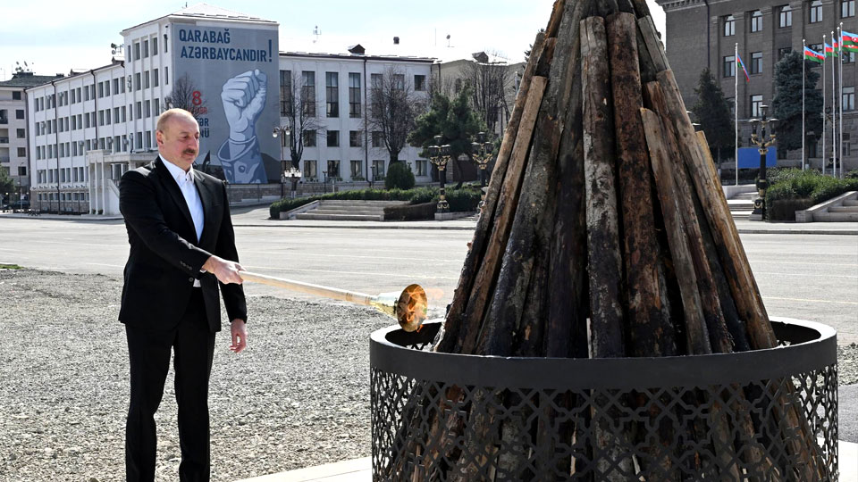 Azerbaijanis celebrate the Novruz holiday annually, upholding their Shaman Turkic origins with numerous spring-welcoming rituals. Of these rituals, jumping over a bonfire is a key component, and President Ilham Aliyev celebrates the Novruz by lighting a symbolic bonfire in a major city every year. This year the designated city was Khankandi and President Aliyev celebrated the holiday with a speech on territorial integrity.