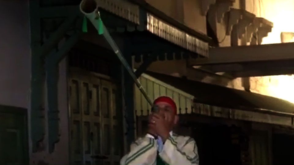 Traditional Ramadan Crier, 'Nafar', walks the paths and alleys in the old city in the early morning hours, playing a certain tune with a long trumpet-like instrument to wake the fasting Muslims up for the Suhoor meal. As a symbol of tradition, he usually dons a special set of traditional clothes, a long shirt or "Jallaba", a headpiece or 'Tarbouch", leather slippers "Belgha" and white socks. As for the upscale neighborhoods, most of them do not need the Nafar, reasoning it with use of a phone or an alarm clock.