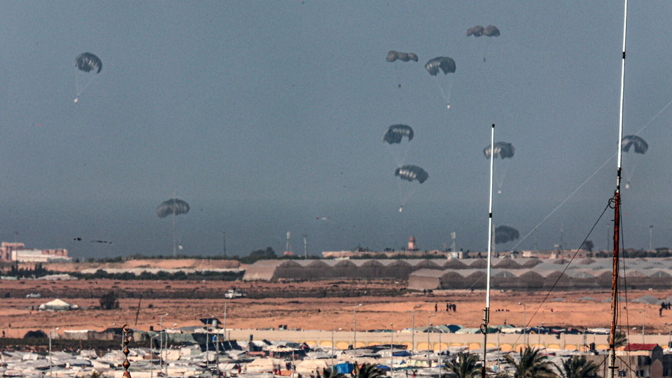 While US officials pressure Israel to open more crossing points for aid trucks into Gaza, US military parachutes hundreds of bundles containing 38,000 ready-to-eat meals. The airdropped humanitarian aid is said to be the beginning of US support of Gazans on the verge of famine. Meanwhile, US Vice President Kamala Harris urged Hamas to agree to an immediate six-week ceasefire deal and demanded that Israel allow more aid into Gaza.