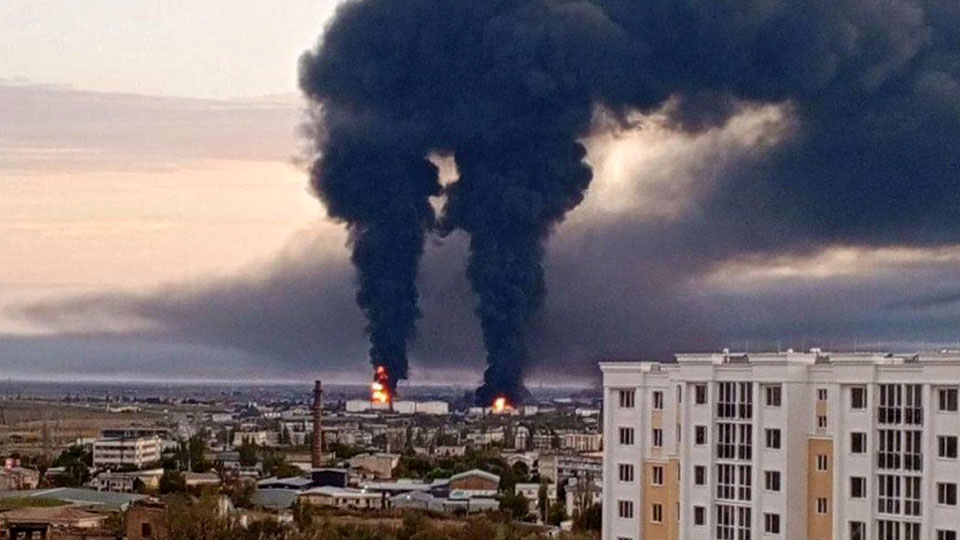 Ukrainian forces reportedly struck a large oil terminal overnight on the occupied Crimean peninsula as Moscow claimed the capture of another village in east Ukraine. At least five civilians were killed by Russian attacks – including in a strike on a civilian ship in the port of Odesa – as well as in the east and the south of the country. Over 1,000 residents have been evacuated due to a fire at a large oil terminal in Feodosia.